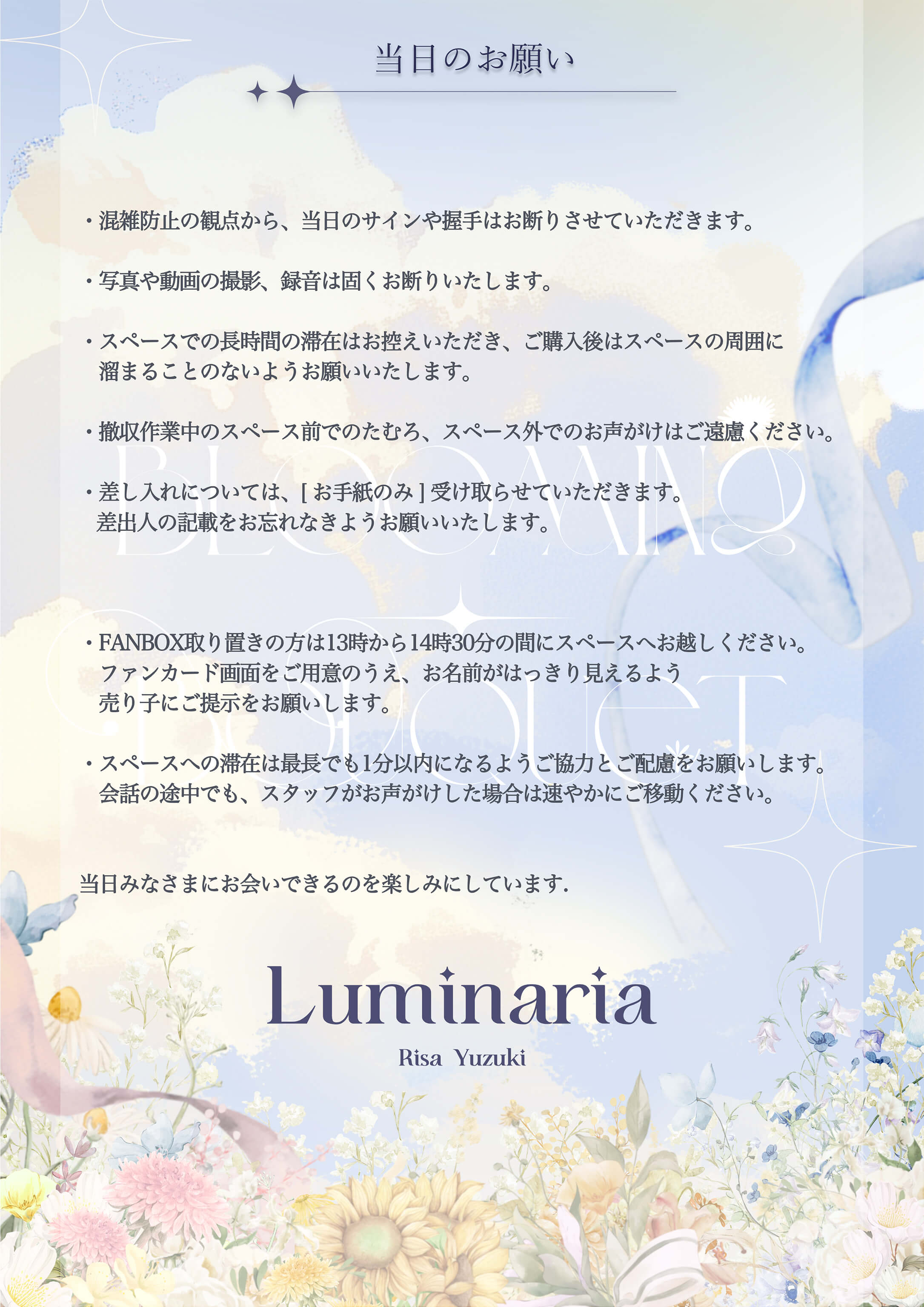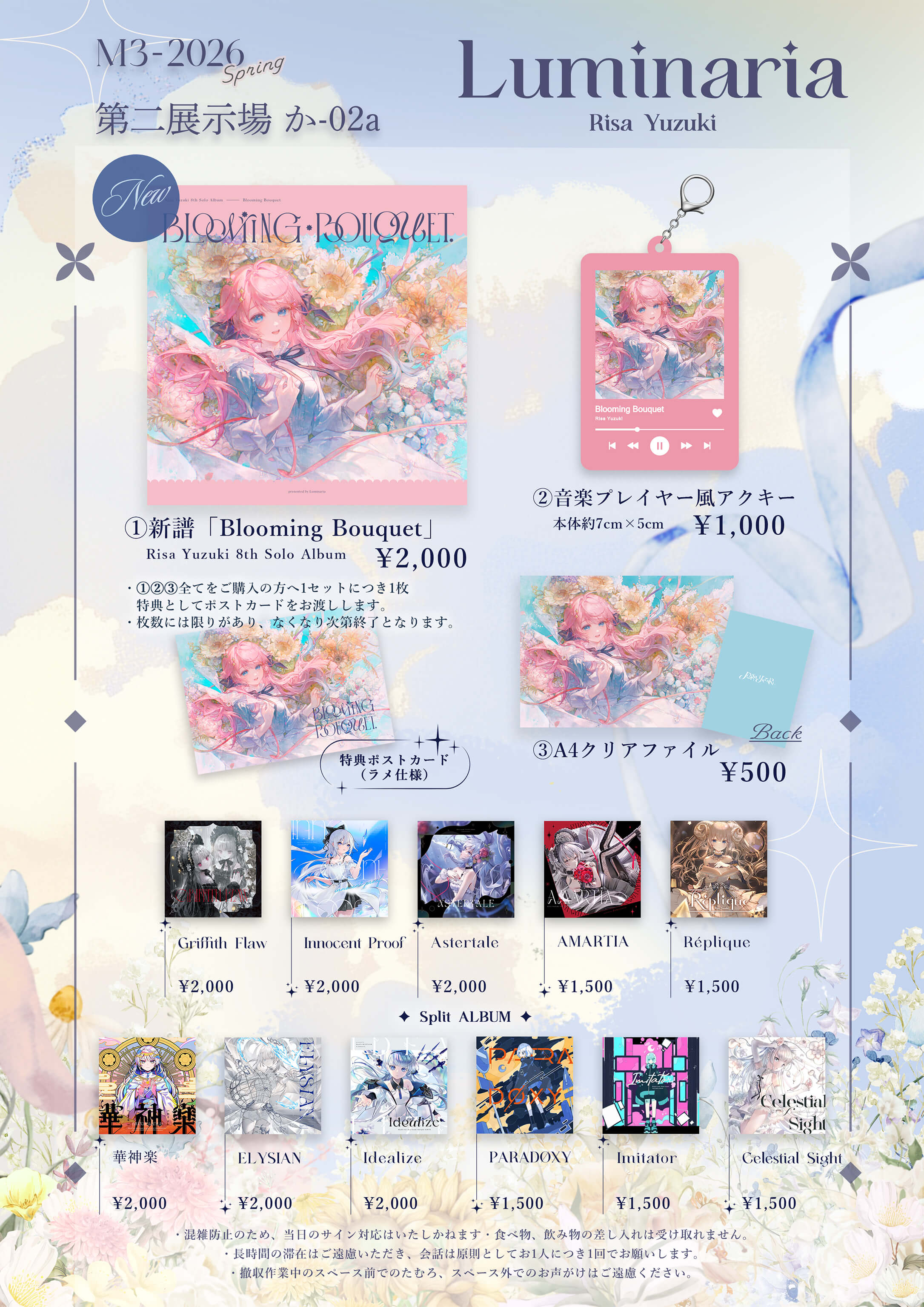 四季を楽曲と共に綴る、Risa Yuzukiによる8枚目のソロアルバム。辿ってきた時間と出会いを花に喩え束ねた1枚。各曲のInstrumentalを含む全13曲を収録。
